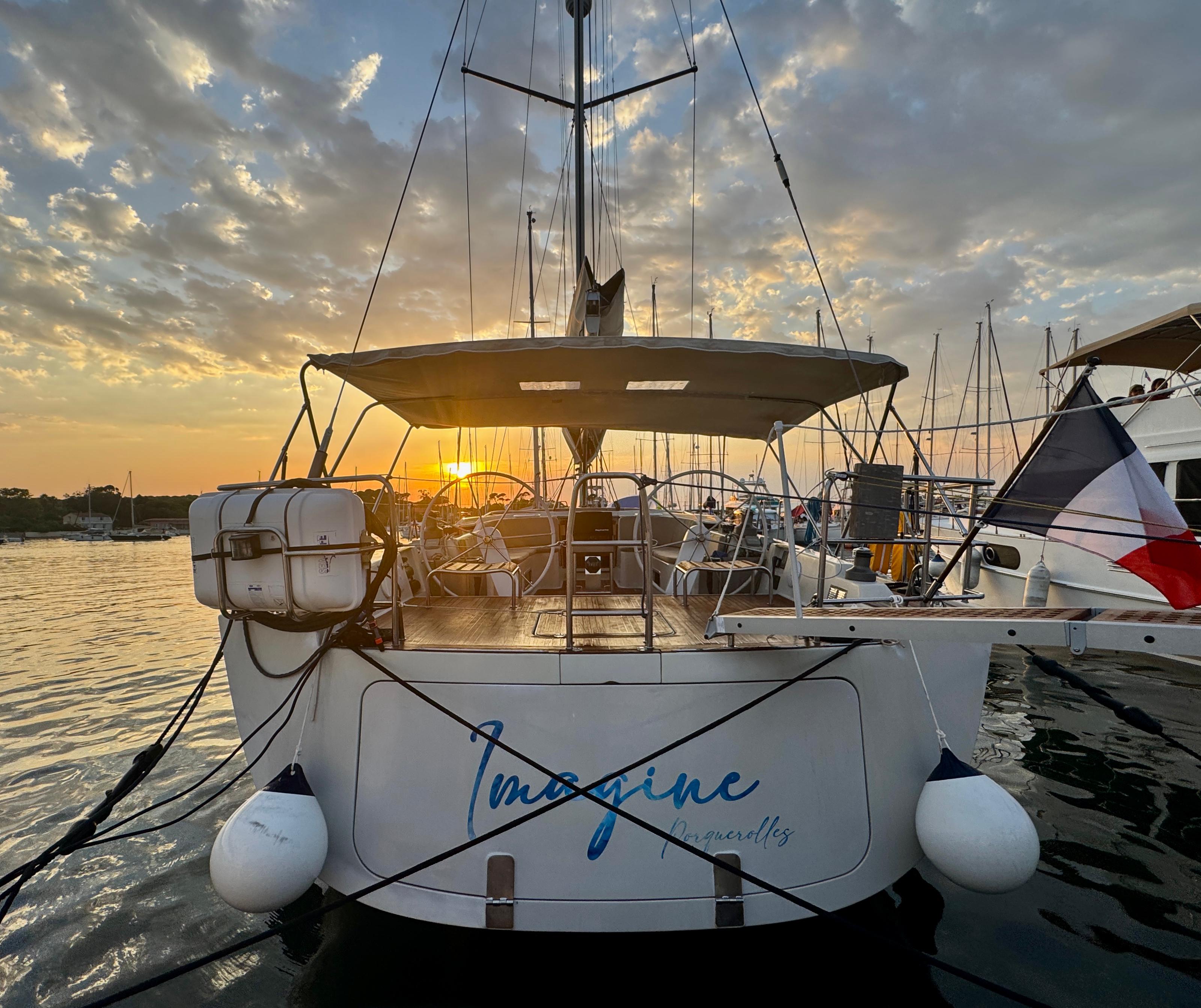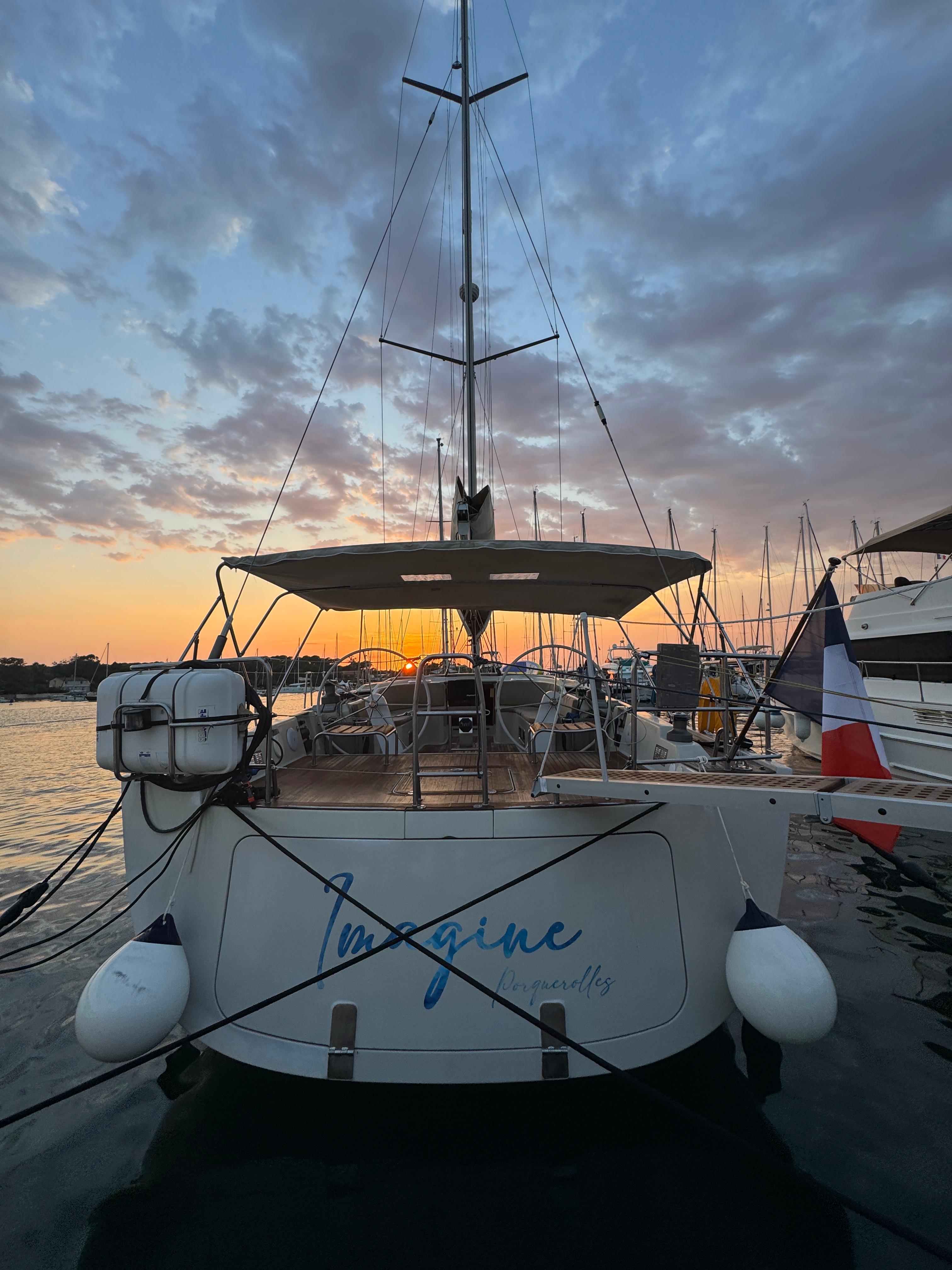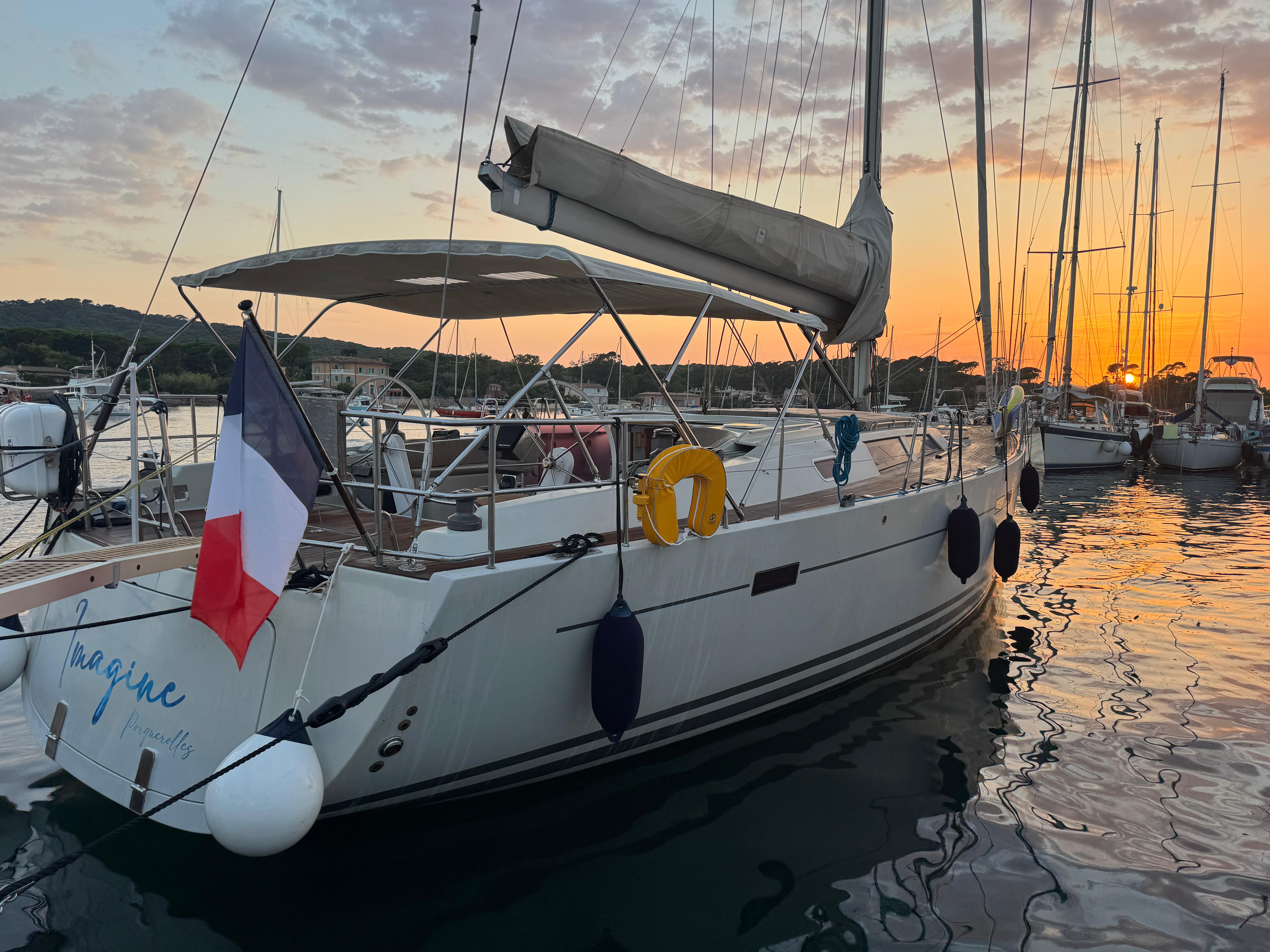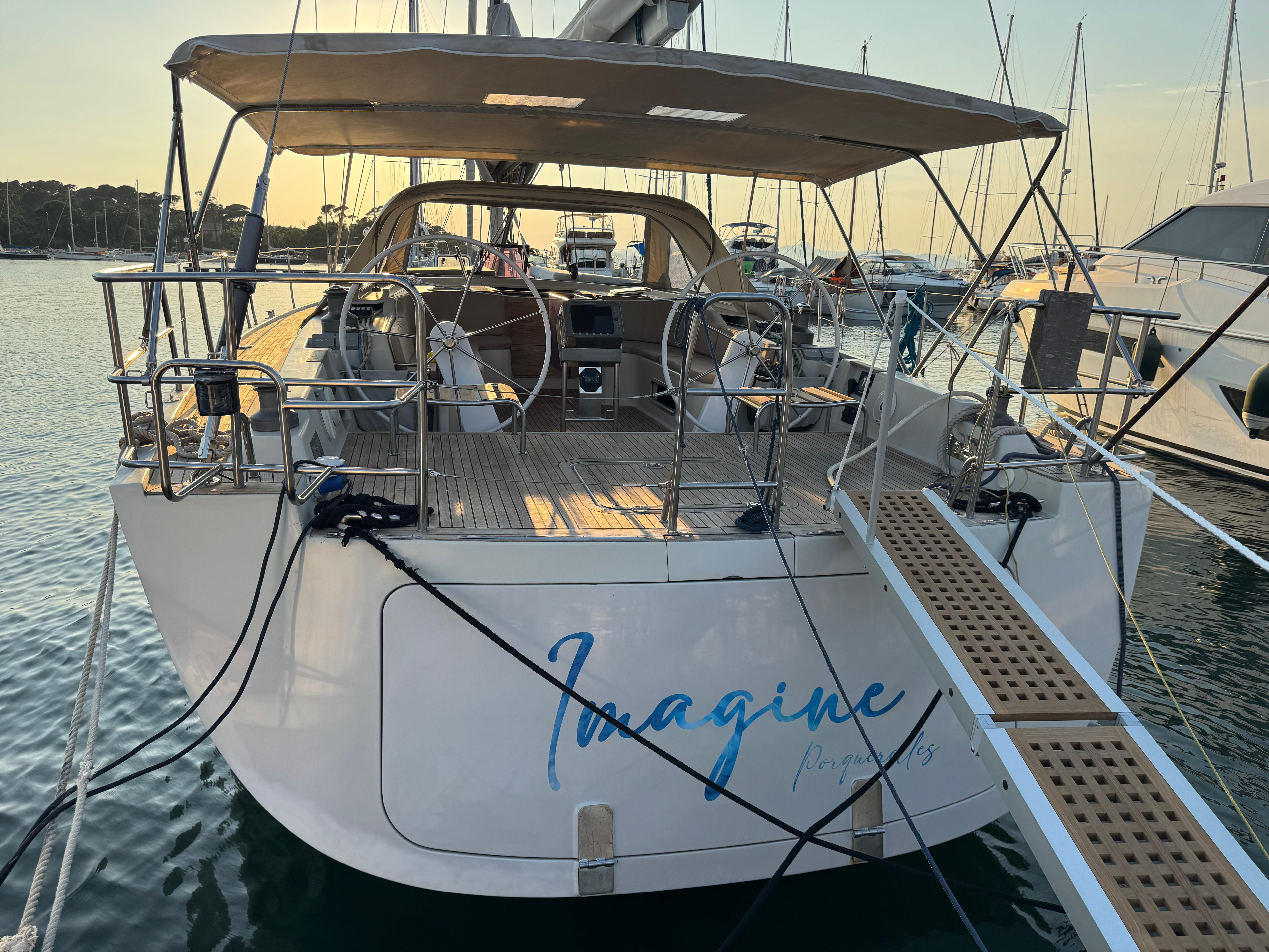 Naviguez en toute liberté à bord du voilier Imagine (Hanse 540e - 16,5 m - climatisé). Idéal pour explorer les criques sauvages des Îles d'Or et leurs eaux cristallines.